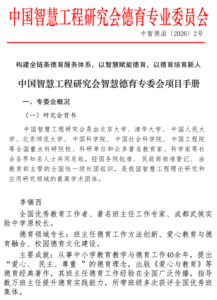 李镇西称,几天前,一位农村一线教师问他,是不是中国智慧工程研究会德育专业委员会聘请的专家,并给他发送了两份电子文件。一份是《关于组织申报中国智慧工程研究会德育专业委员会“十五五”教育科研规划课题的函》,一份是《中国智慧工程研究会智慧德育专委会项目手册》。前者列出了许多关于德育创新的课题,希望有意愿者申报;后者列出了“专家智库”的名单。