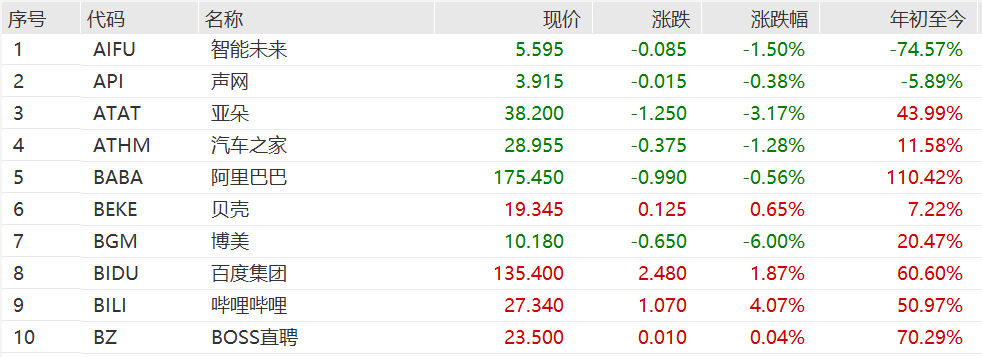 个股方面,大全新能源涨9%,世纪互联涨超7%,金山云涨超6%,蔚来、小鹏汽车涨超4%;名创优品跌近4%,亚朵跌超3%。