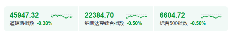 美国三大股指小幅收跌。截至收盘,道指跌0.38%,报45947.32点;标普500指数跌0.5%,报6604.72点;纳指跌0.5%,报22384.7点。
