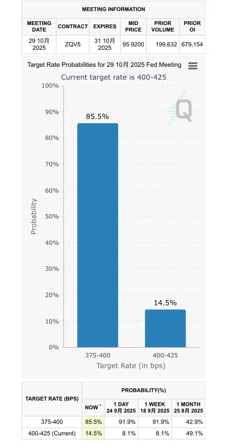 昨夜今晨,多位美联储官员就降息及经济话题发表了讲话。美联储最新降息25个基点概率降至85.5%。