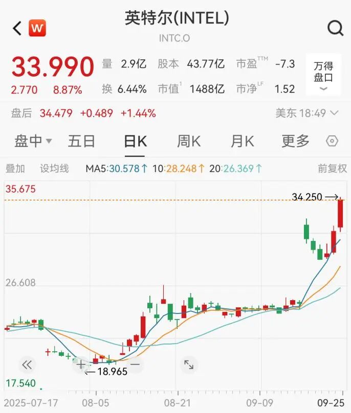 英特尔延续前一日上涨态势,截至收盘,股价报33.99美元/股,大涨8.87%。